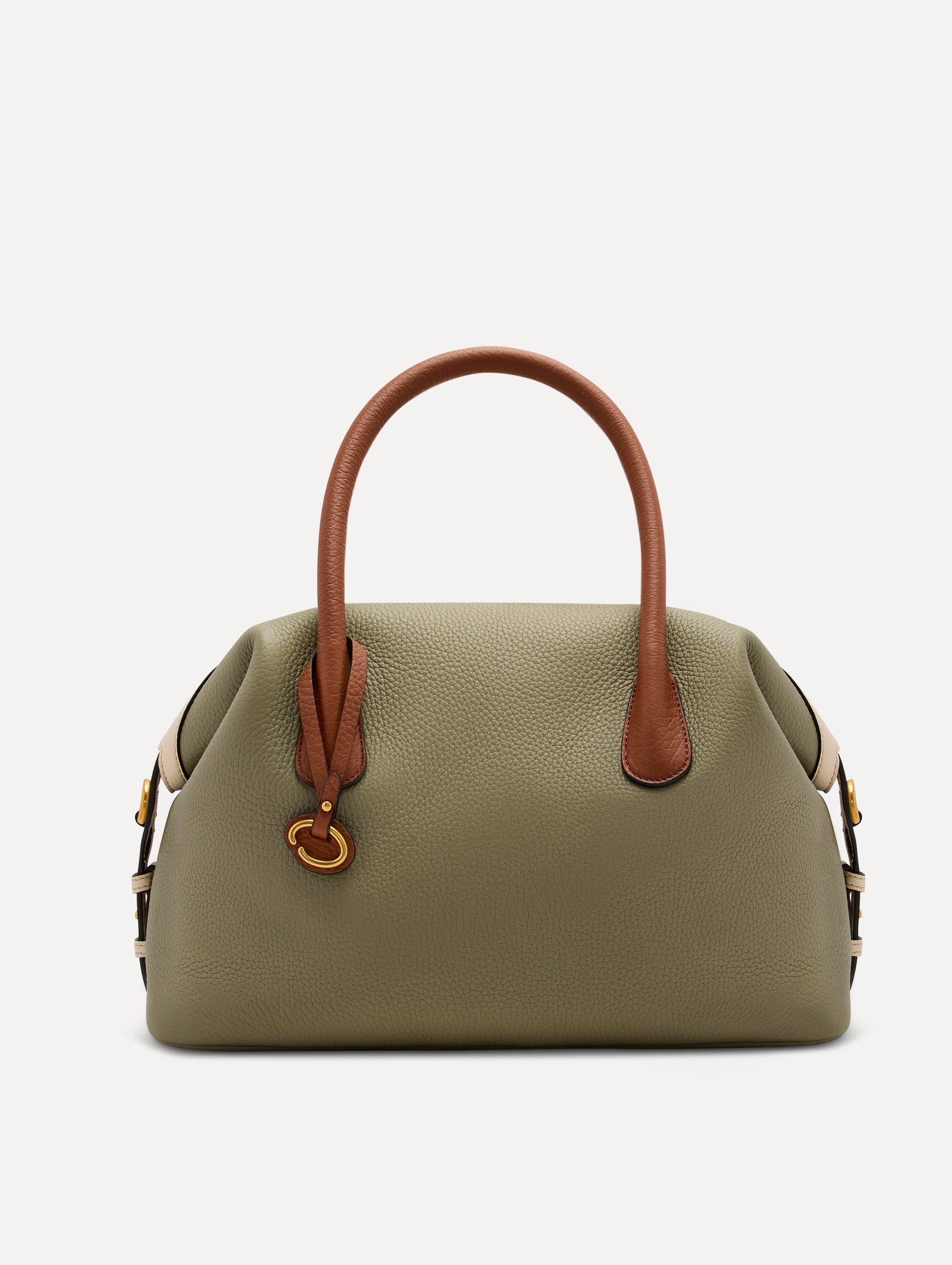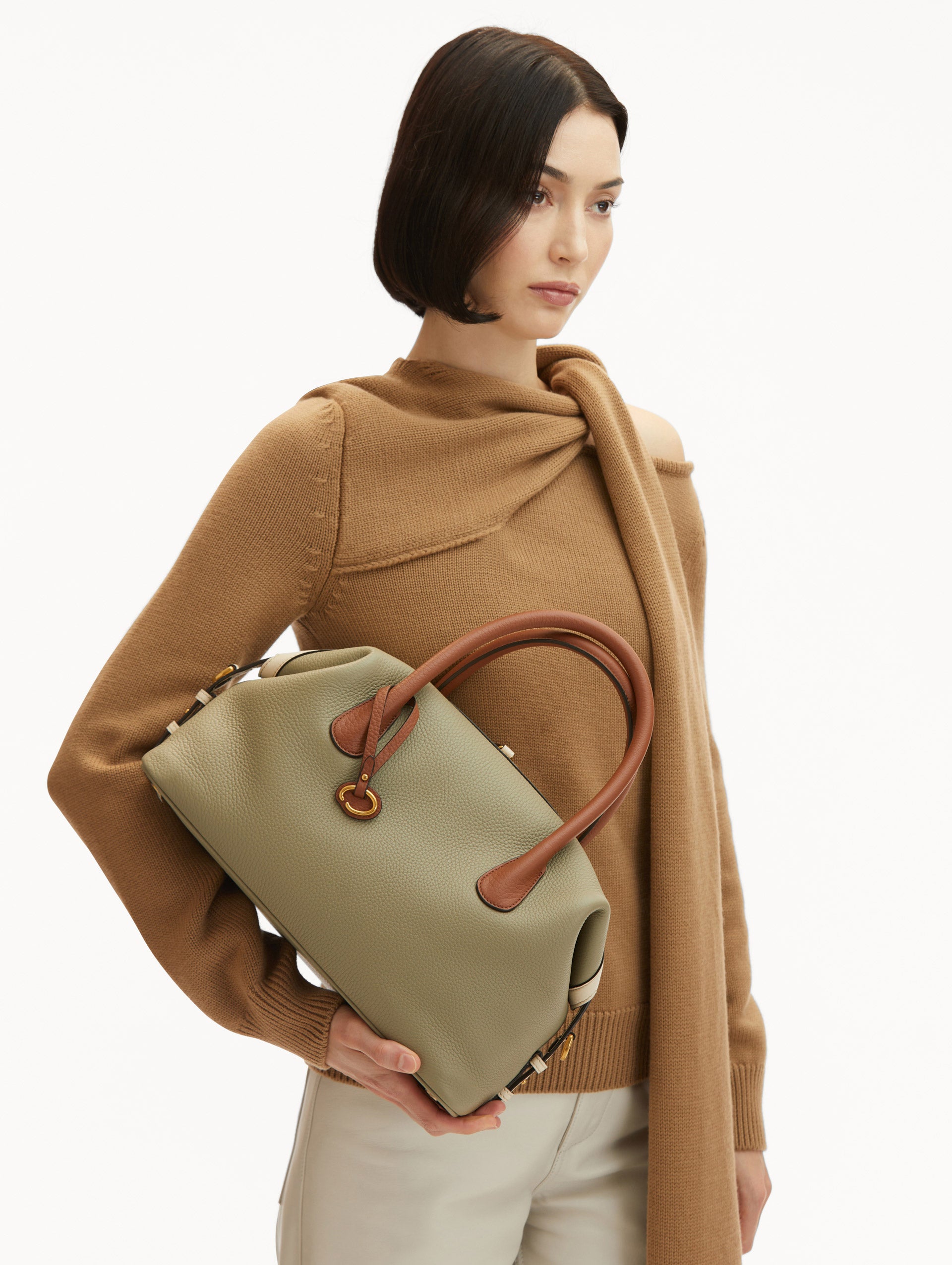 • Model in Brown Sweater and White pants Wearing The Dahlia Duffle Bag in Sage Green with Brown Top Handle. Front View