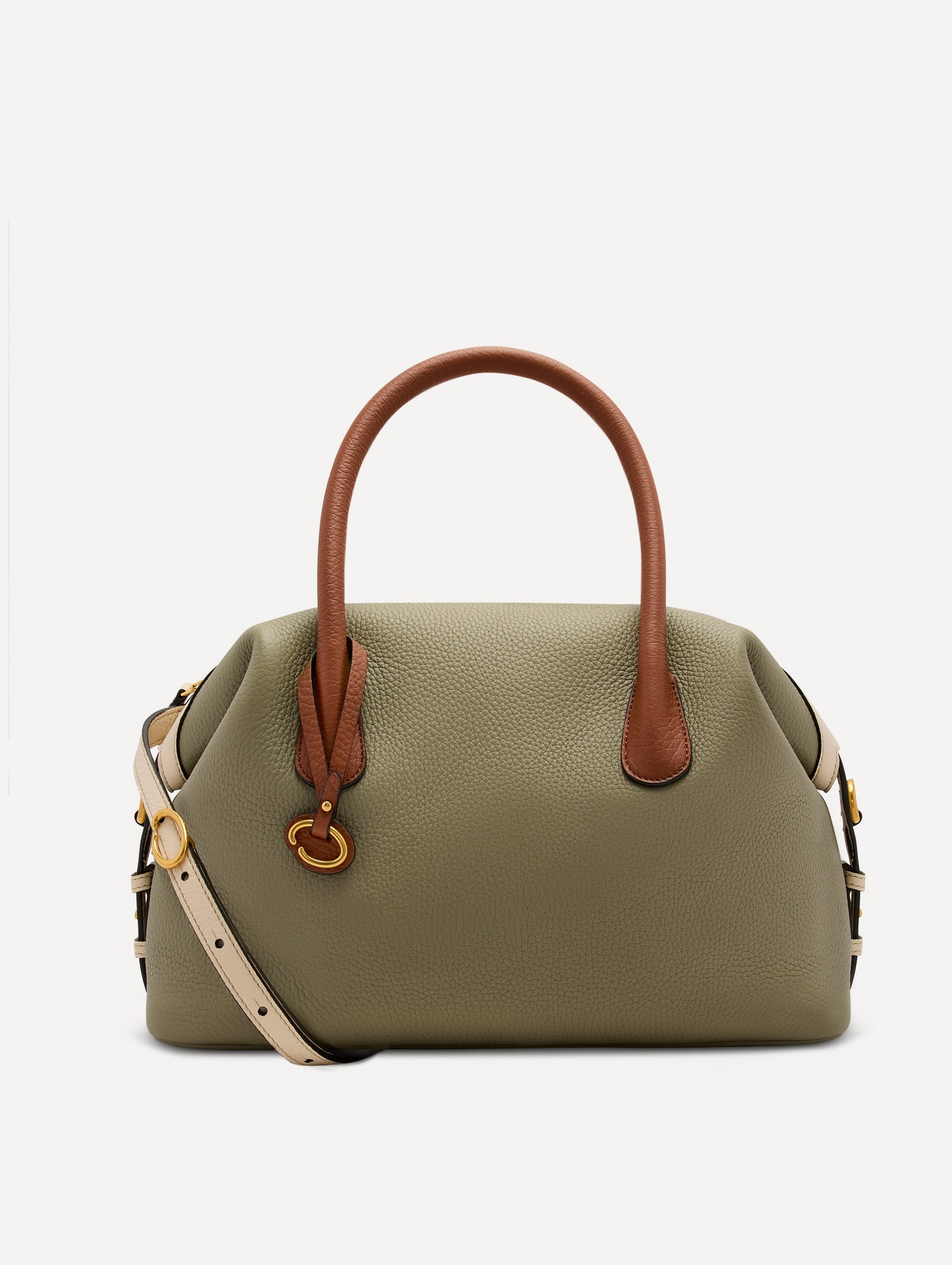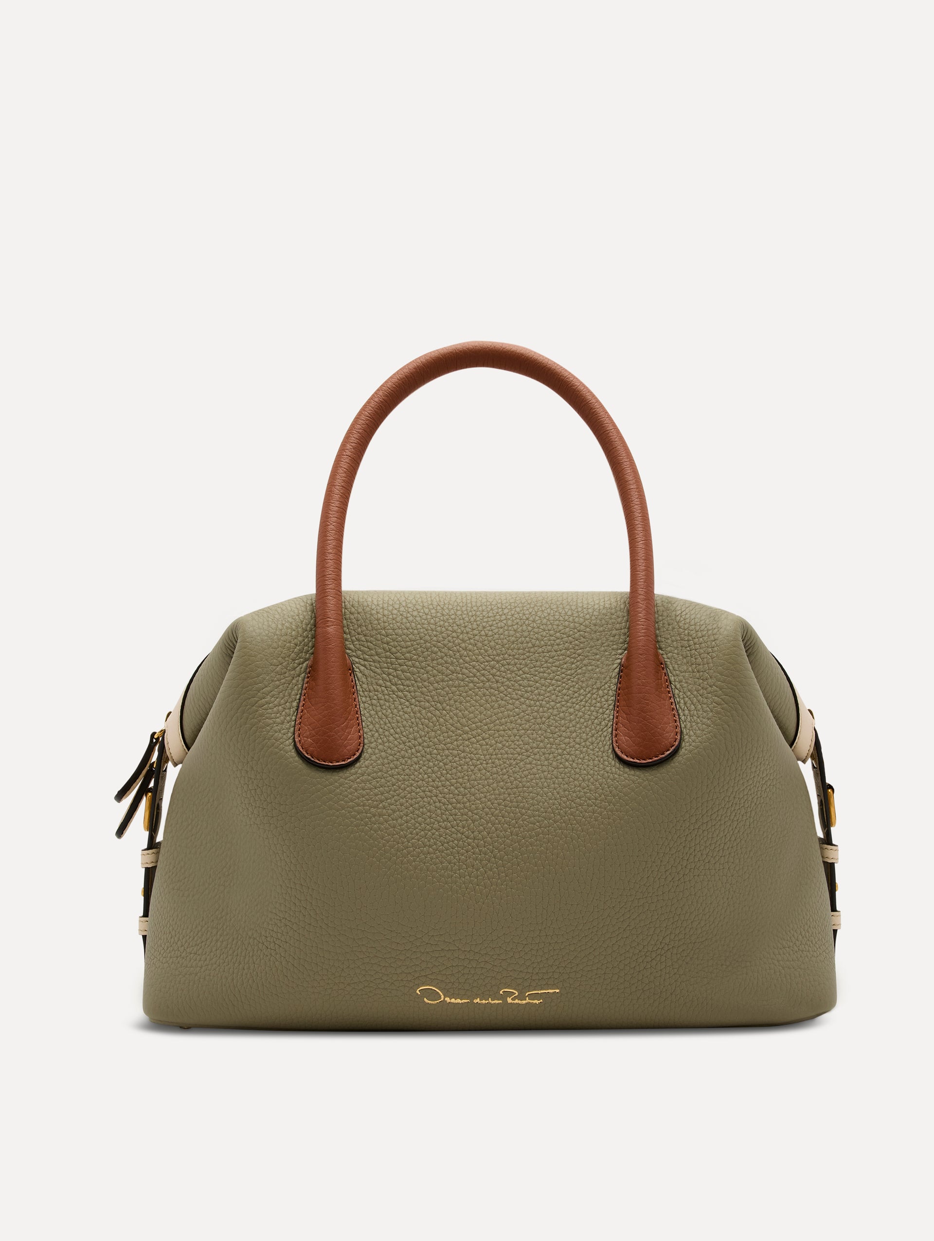 • Light green bag, with cognac handle, white crossbody strap, and gold Oscar logo in the handle. Front View.
