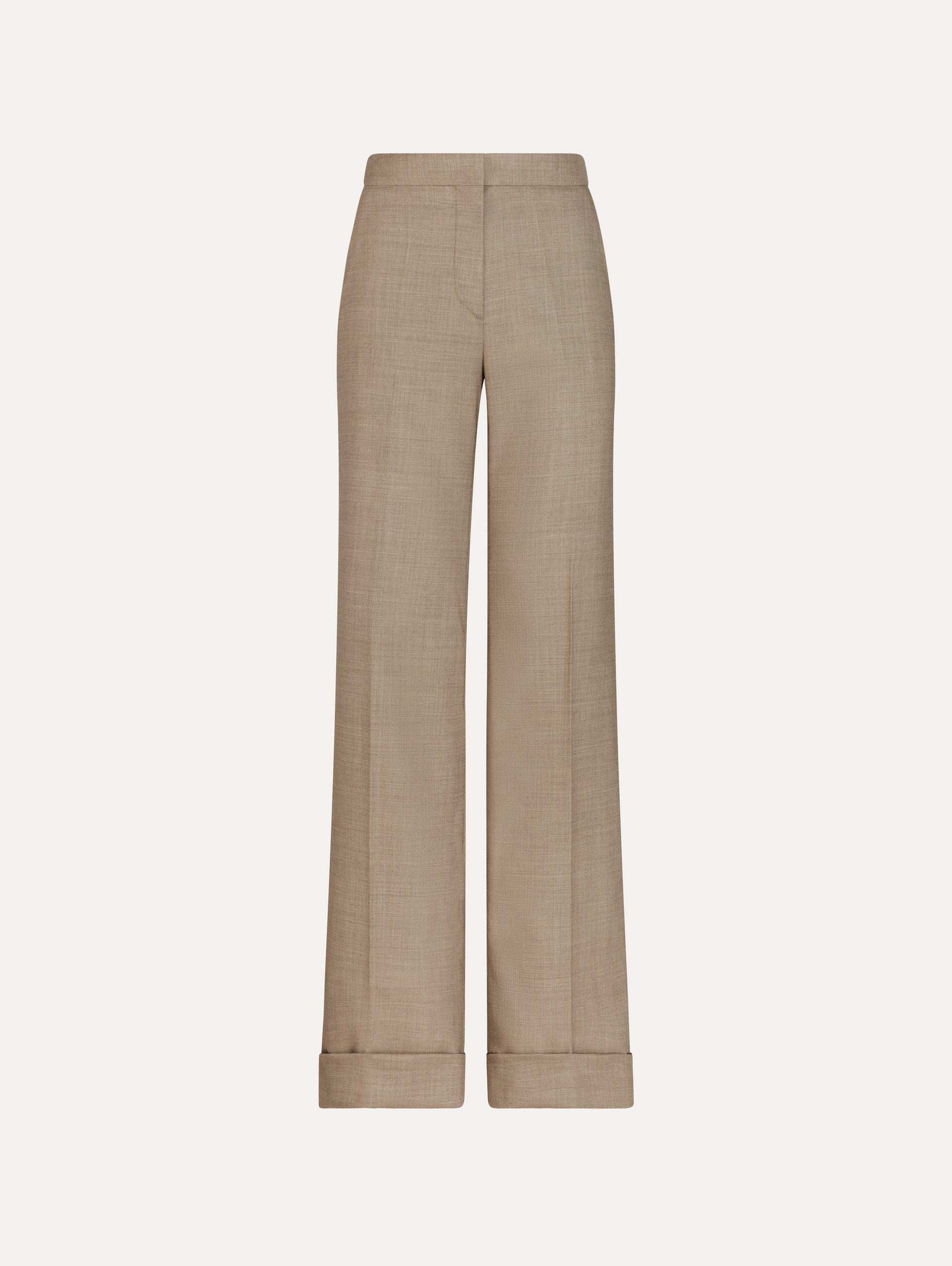 • High waisted, taupe Wool-Blend Wide-Leg Pant. Cuffed. Front View.