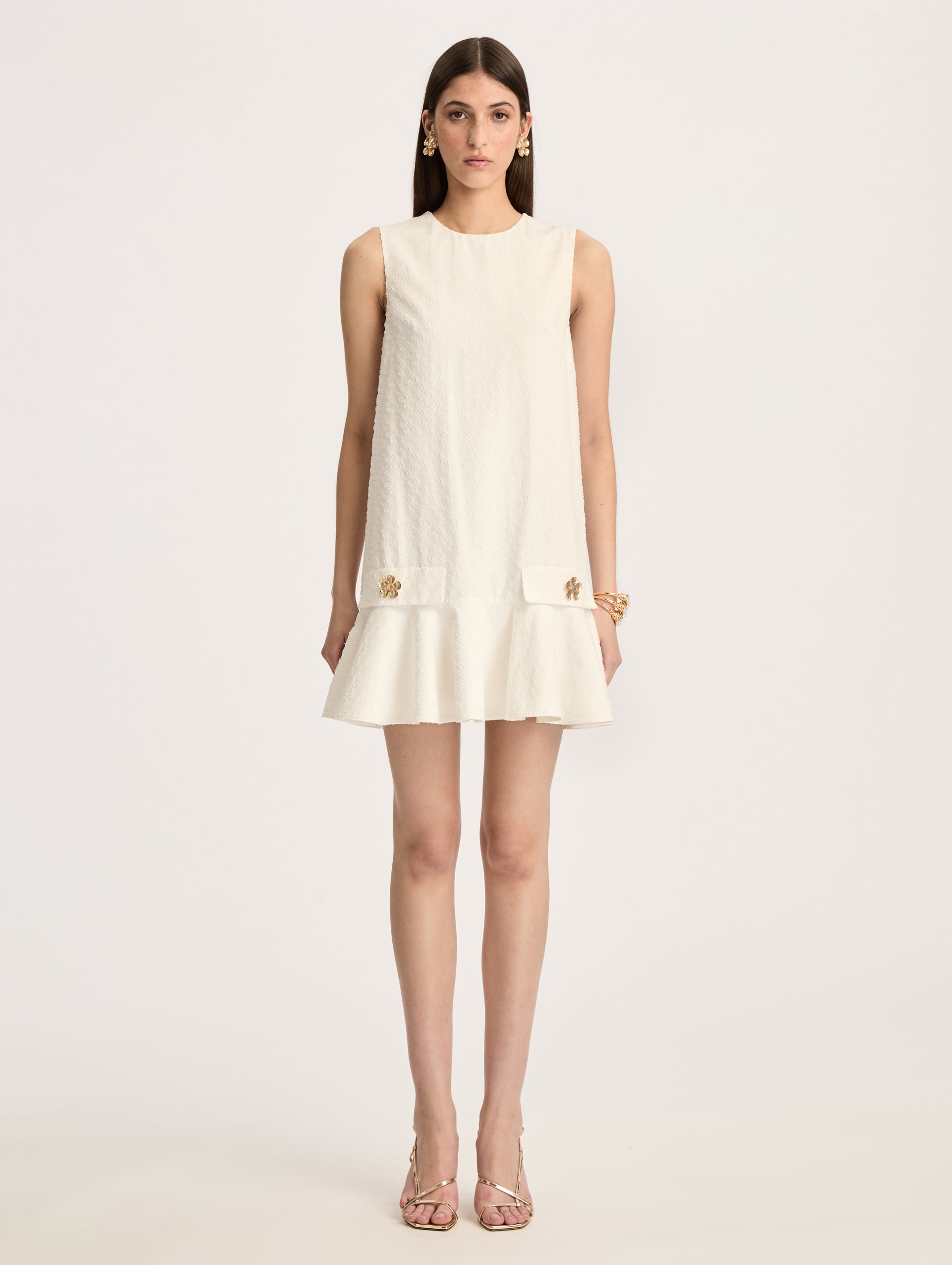 • White Oscar Chain-Link Cotton Poplin Dress with drop waist, flared hem, and gold floral button accents on front pockets. Front View.