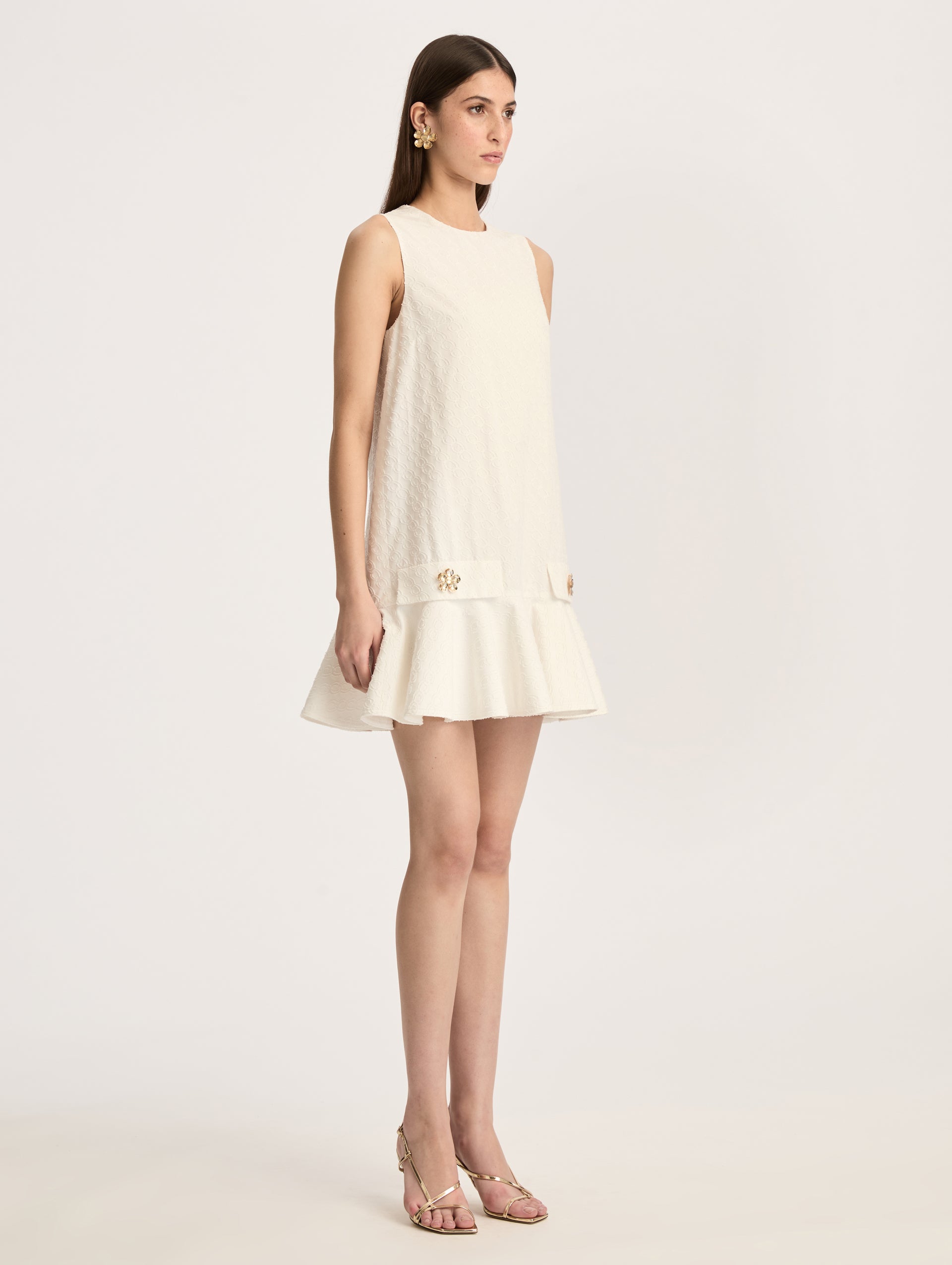• White Oscar Chain-Link Cotton Poplin Dress with drop waist, flared hem, and gold floral button accents on front pockets. Side View.