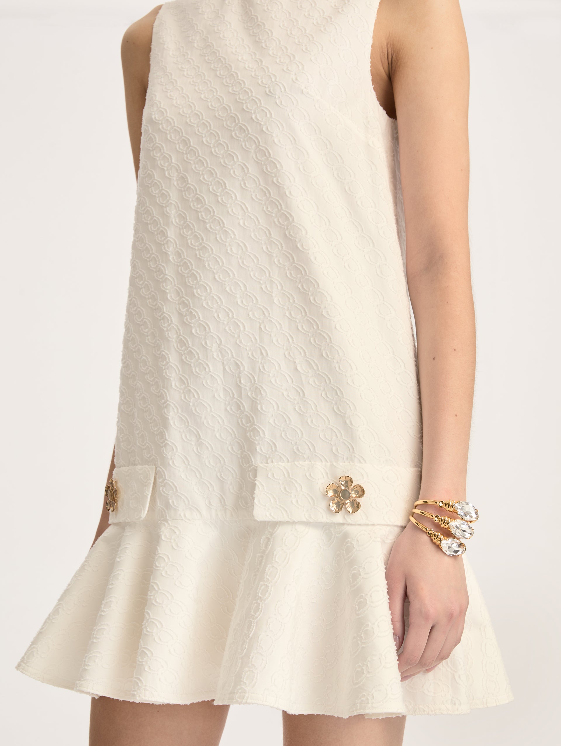 • White Oscar Chain-Link Cotton Poplin Dress with drop waist, flared hem, and gold floral button accents on front pockets.