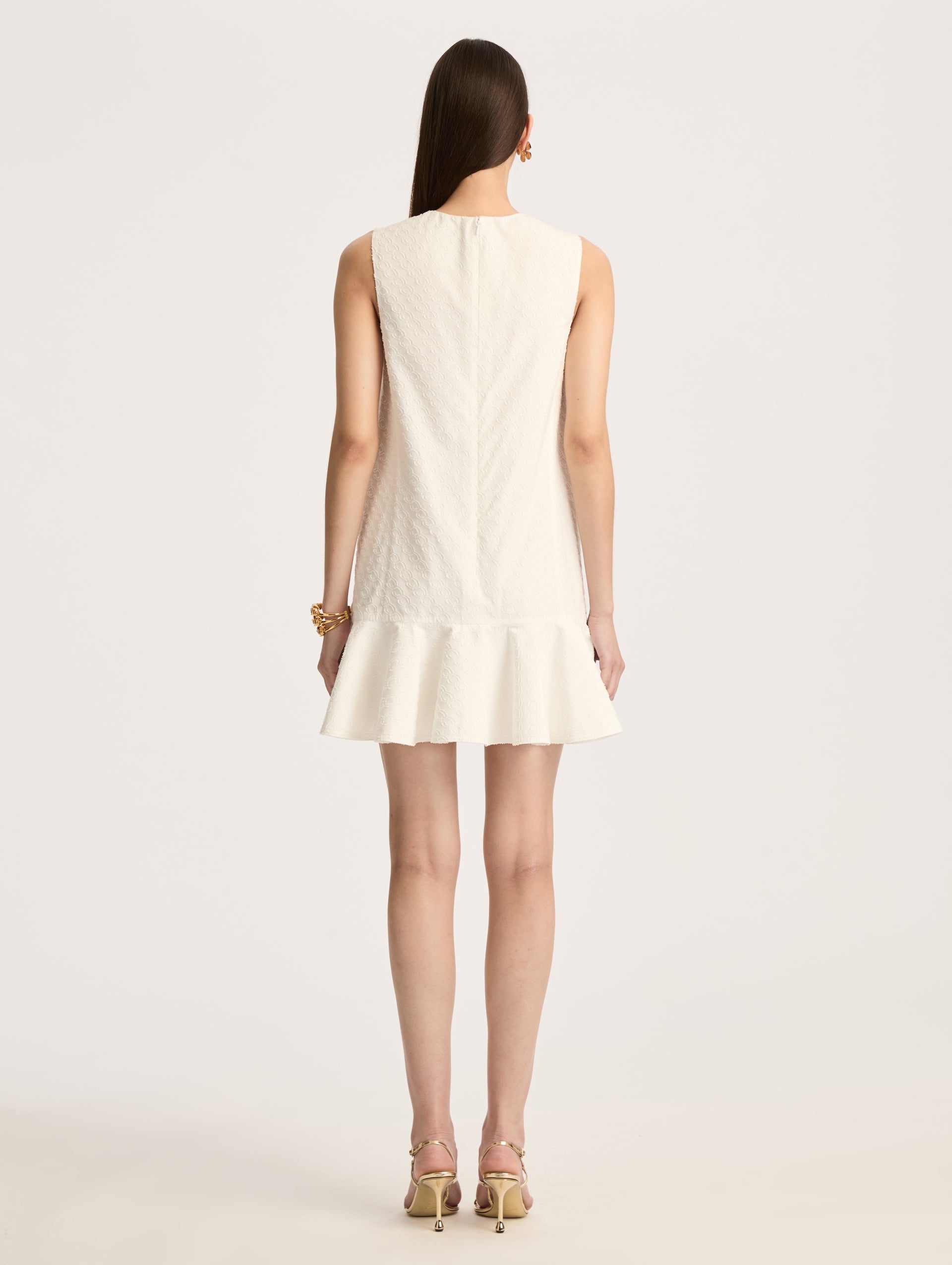 • White Oscar Chain-Link Cotton Poplin Dress with drop waist, flared hem, and gold floral button accents on front pockets. Back View.