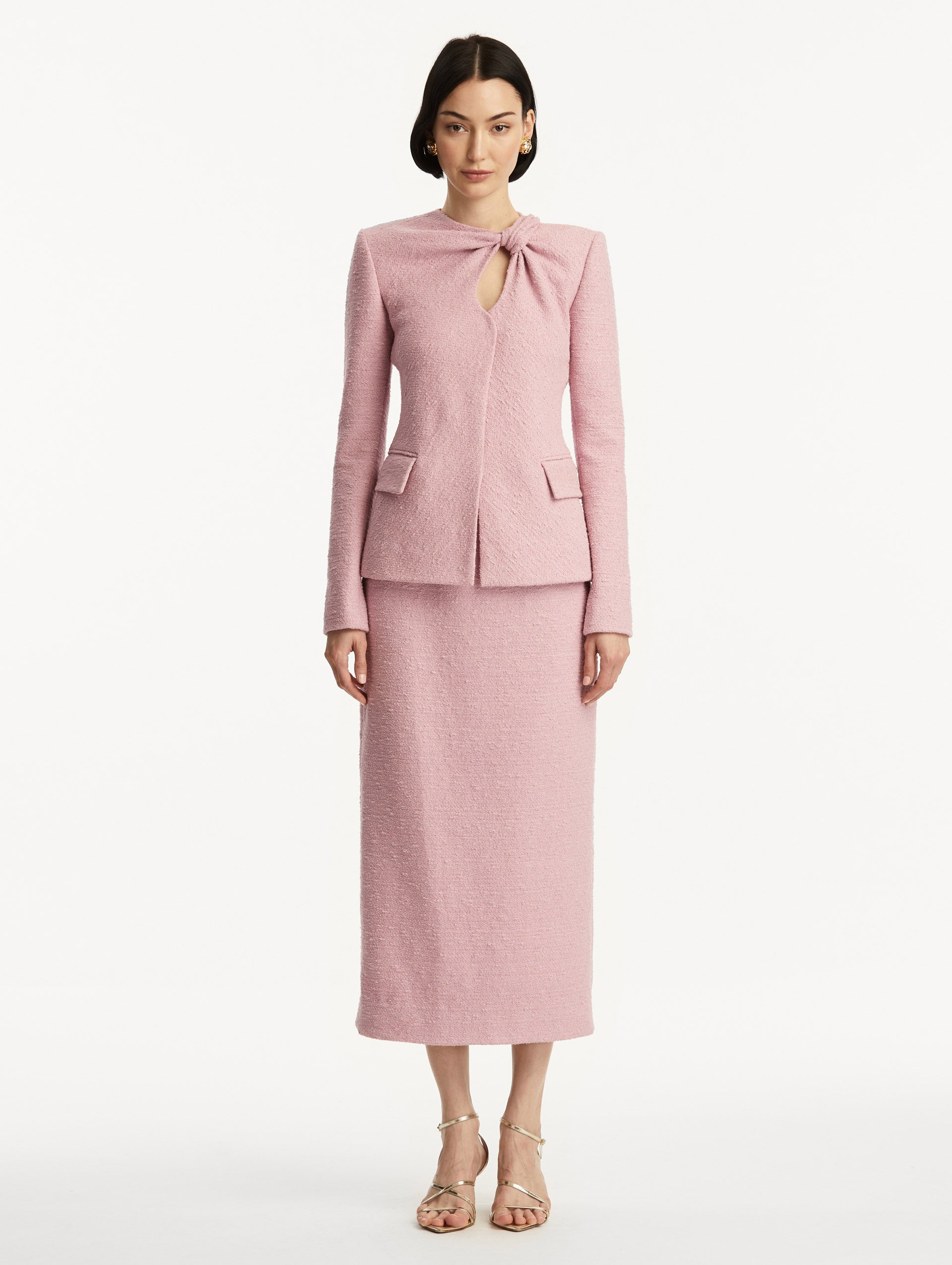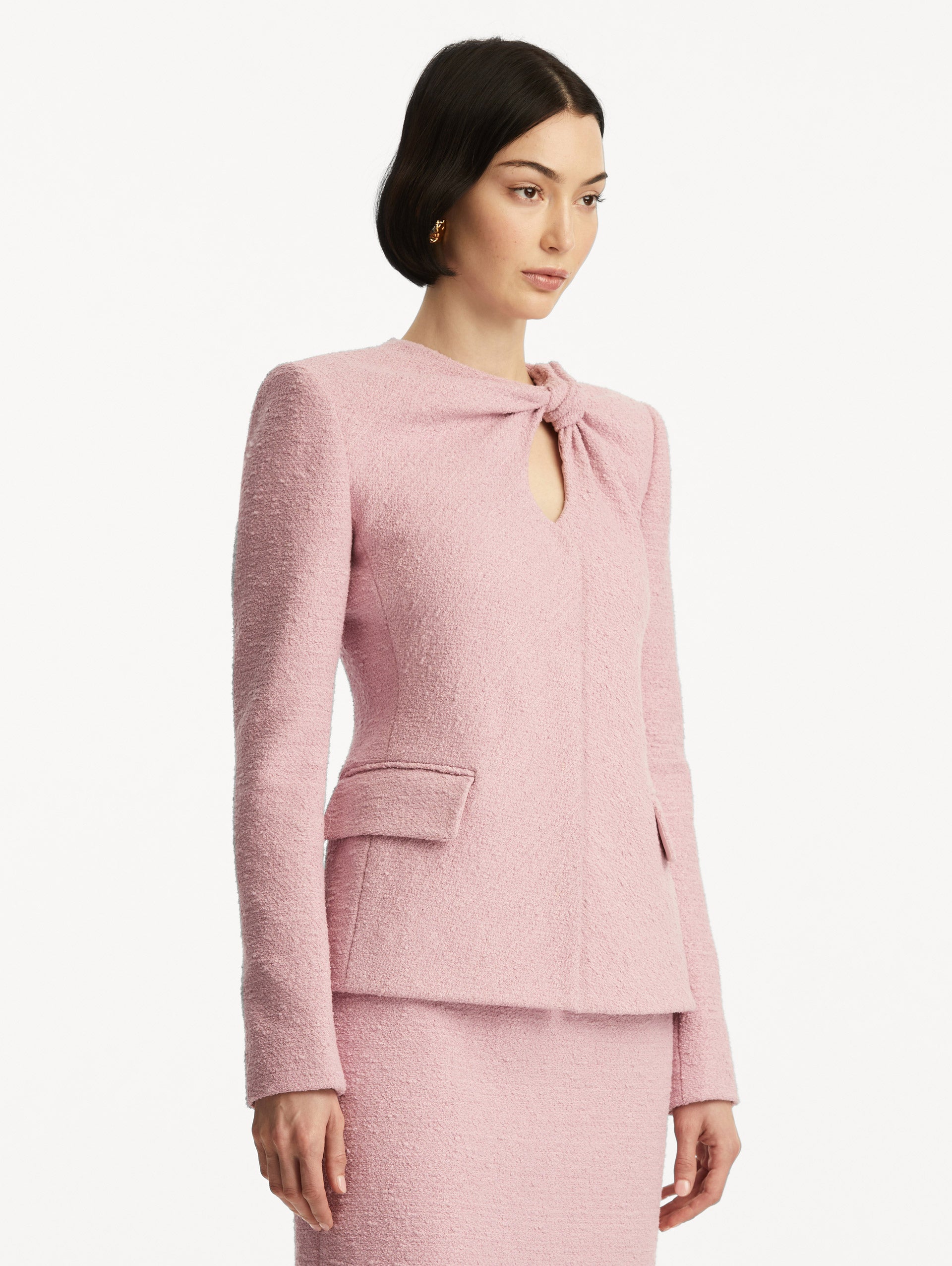 • Light pink tweed jacket with a twist detail in the top corner, paired with a matching skirt. Side View.