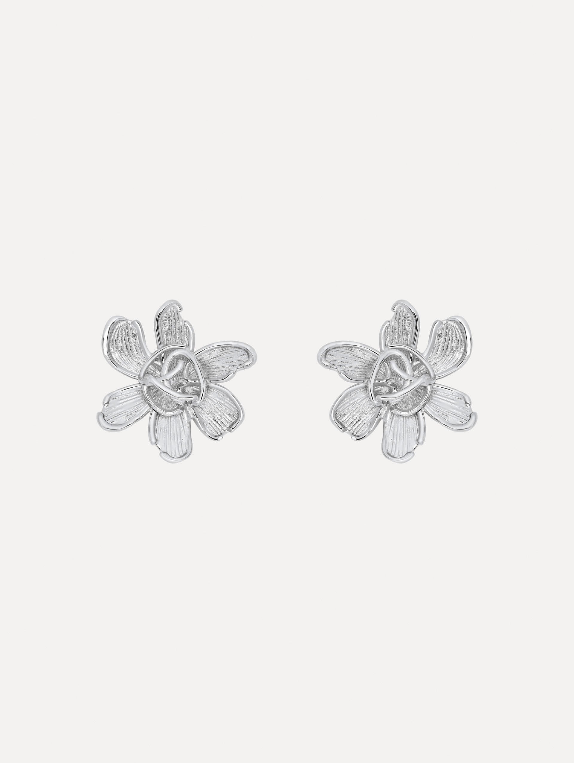 • Floral post back silver earrings with sculpted petals with the Oscar 'O' and a braided emblem at the center.
