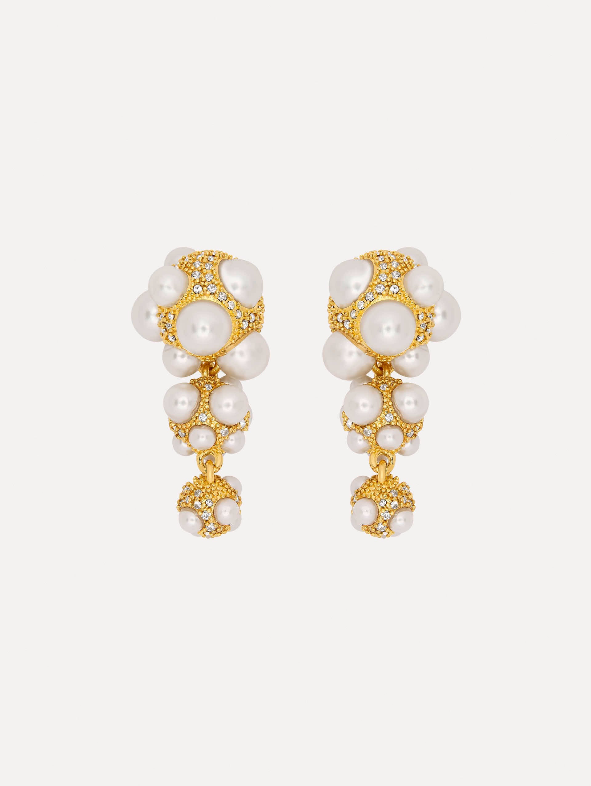• Triple drop earrings with clusters of faux pearls in gold-tone settings, each sphere adorned with pavé crystals.