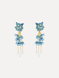 Tonal petals form a soft gradient in these floral drop earrings, accented with delicate beaded fringe. Finished with white drops, they bring movement, texture, and a touch of garden whimsy.