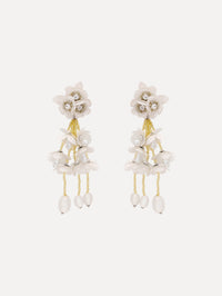 • Model is wearing tonal petal earrings which form a soft gradient in these floral drop earrings, accented with delicate beaded fringe. Finished with white drops.
