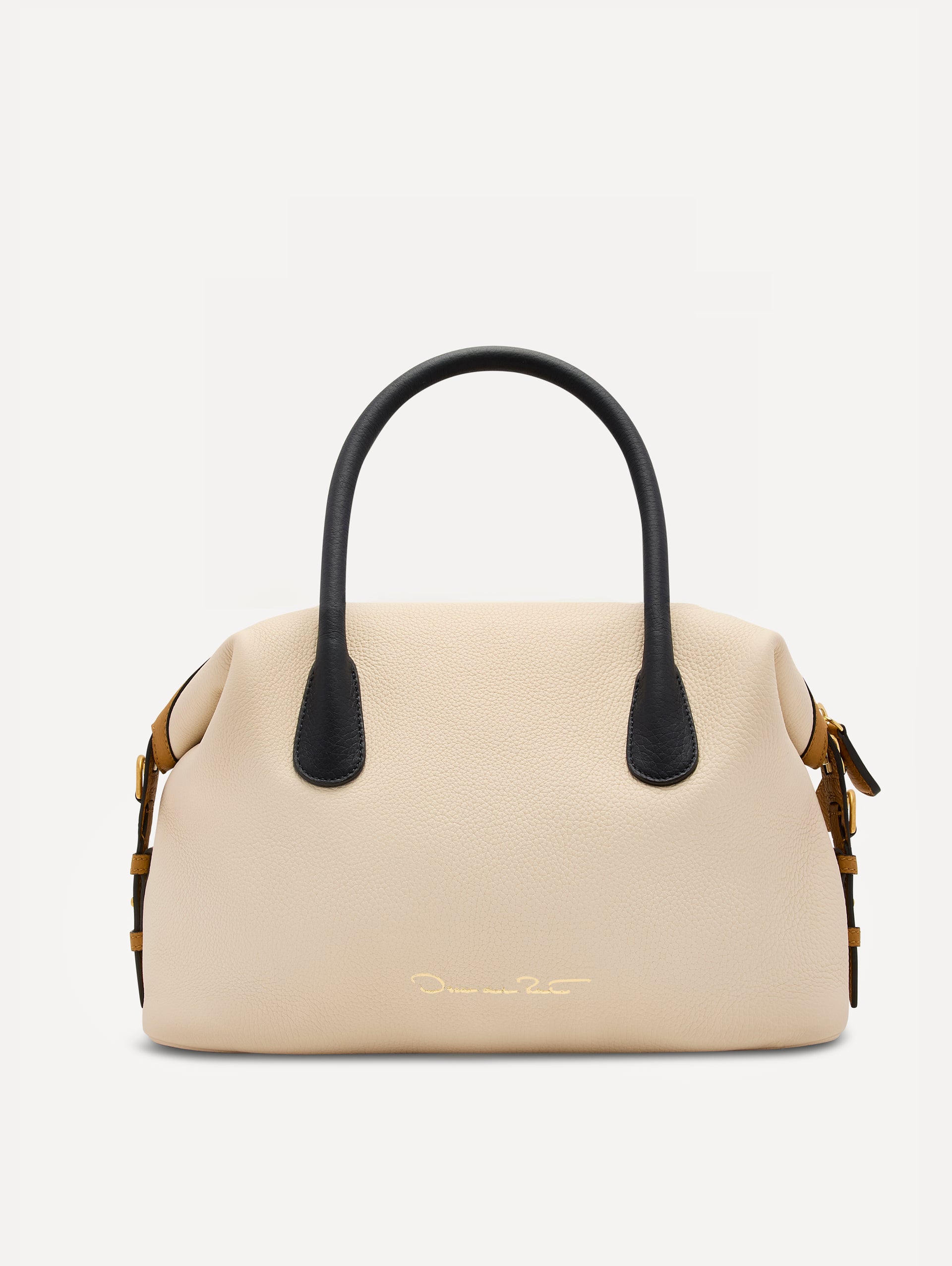 • The Dahlia Handbag in Ivory with Black Top Handle and Honey sides. Adorned with Oscar de la Renta's signature logo in the bottom center of the back of the bag. Front View.