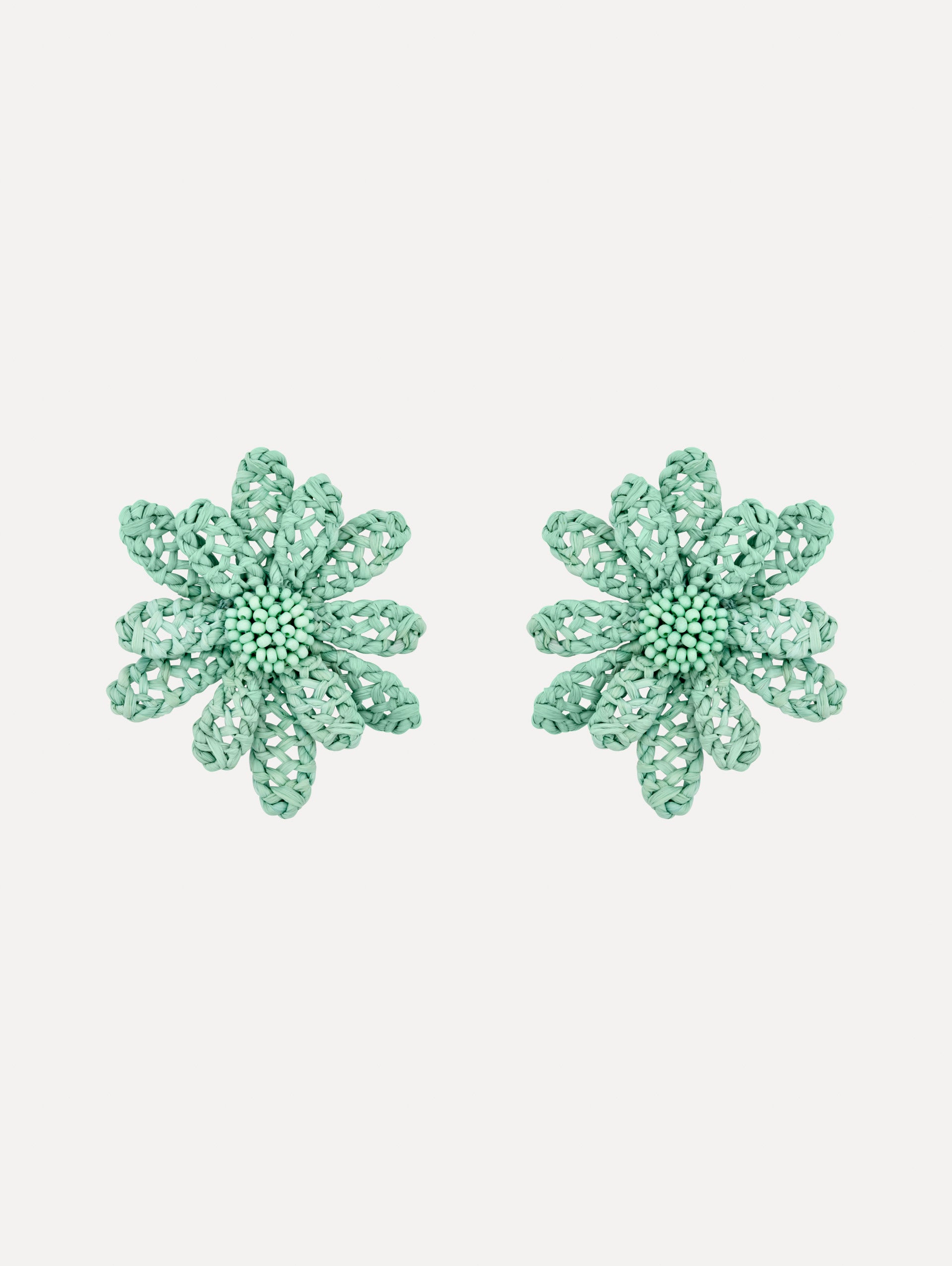 • Aqua Large Woven Raffia Flower Earrings with aqua raffia in a flower shape. Front View.